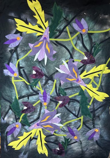 Applique, machine and hand quilting, hand embroidery (61cm W x 80cm H) Inspired by the undergrowth along the Holme river ON LOAN